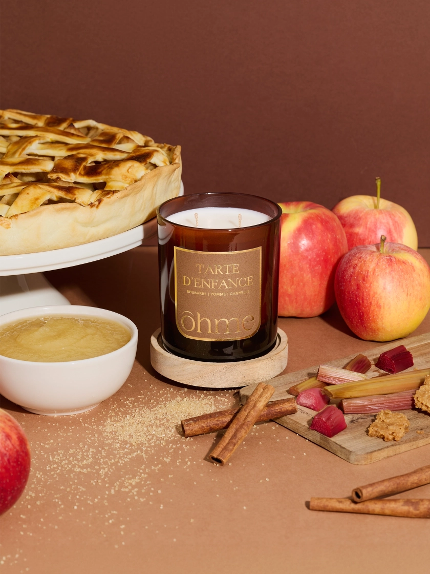 Bougie parfumée fruitée et gourmande mêlant la pomme, la rhubarbe et la cannelle